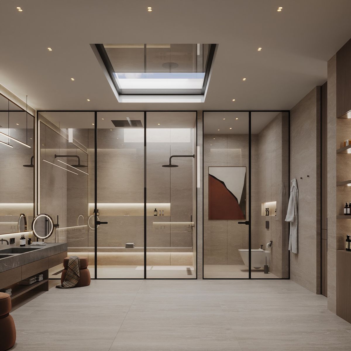 以镜面、灯光和材质层次完成更纯净的空间秩序。